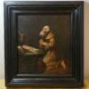 Painting of a praying hermit with book ( bible), skull (Memento Mori), Cruxifix with Corpus Christi, Rosary, Waterjug and Hourglass (Tempus Fugit = use your time well).
